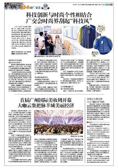 11月1日是广交会第三期的第二天。据悉,本期广交会男女装、内衣、运动服及休闲服、裘革皮羽绒及制品、服装饰物及配件、纺织原料面料、鞋与箱包等展区组成时尚板块,展览面积23.7万平方米,展位11218个、参展企业5051家。新快报记者在现场注意到,第三期参展企业将科技创新与时尚个性相结合,助力提升人们的生活品质,造就美好生活体验。