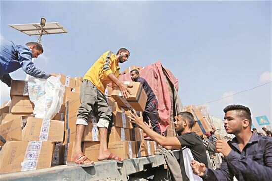 ■11月2日,在加沙地带南部,人们从卡车上卸下人道救援物资。 新华社发