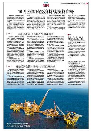据新华社电 国家统计局15日发布的数据显示,10月份,国民经济持续恢复向好,生产供给稳中有升,市场需求持续改善,就业物价总体稳定,转型升级扎实推进。