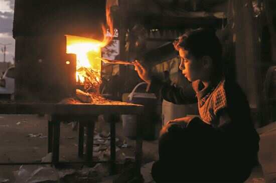■一名男孩在加沙地带南部城市汗尤尼斯街头用柴火做饭。加沙地带供应因封锁受限,人道主义状况日益恶化。新华社发