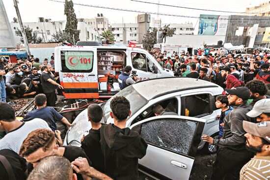 ■11月3日,在加沙城希法医院门口,人们查看被袭击的车辆。新华社发