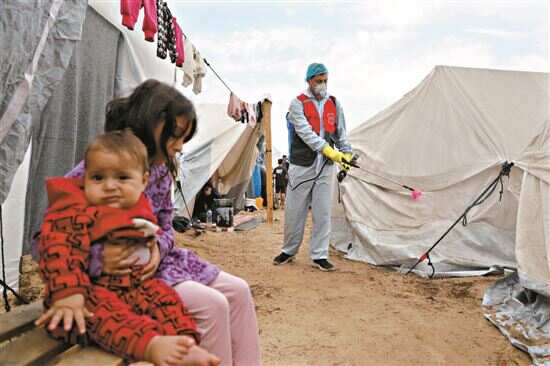 ■工作人员在加沙地带南部城市汗尤尼斯一处临时难民营喷洒消毒液。新华社发
