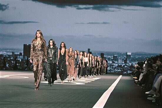 身形健美、活力四射的“泳装美人”,是好莱坞电影里的标志性形象,也是大秀开场的运动女孩形象。黑色泳衣幻变出更多的可能,或古典,或前卫;5号图案短T恤和高腰短裤的配搭,长袜套与运动鞋的配搭,都让运动风变得更加抢眼。上世纪二三十年代电影明星的迷人形象亦在秀场重现,闪亮的时装更是本场大秀的焦点,让人联想起迪斯科舞池里那些五彩绚烂的灯球。