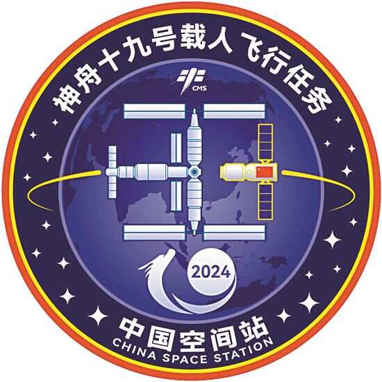神舟十九号载人飞行任务标识是由中国空间站、神舟载人飞船、地球、星空等图案构成的一个红、黄、蓝配色的圆形标识。数字“19”融入中国龙的元素,舞动上升。周围的点点星辰共十九颗,对应神舟十九号载人飞行任务,共同体现我国航天事业的繁荣昌盛。(央视)