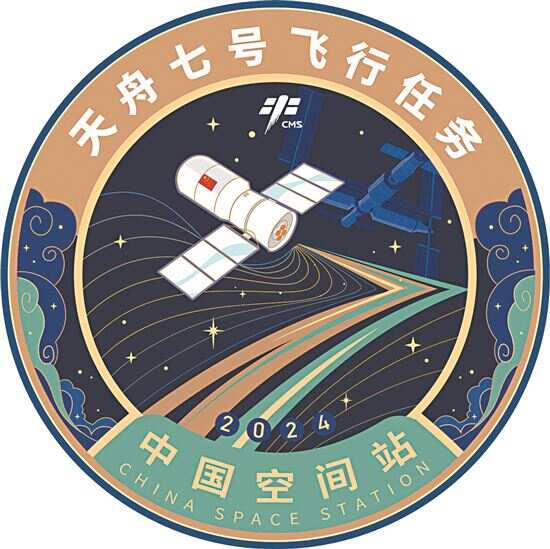 天舟七号飞行任务标识,正中的“7”色彩斑斓、直通远方,象征着我国航天事业在漫漫征程上勇往直前,在广袤太空中书写了浓墨重彩的一笔;空间站在路的尽头隐约浮现,象征本次天舟七号货运飞船将与空间站完成对接。边框提取中国传统云纹进行设计,作为经典的吉祥图案,寓意高升和如意。在万千金色星辰的点缀下,滚滚祥云在两侧舒展流动,护送画面中心的天舟七号货运飞船飞行,表达了对此次任务衷心的祝福。整体配色使用传统中国色彩,边框金镶玉的配色与中心的景泰蓝相结合,二者形成鲜明反差,引人入胜。
