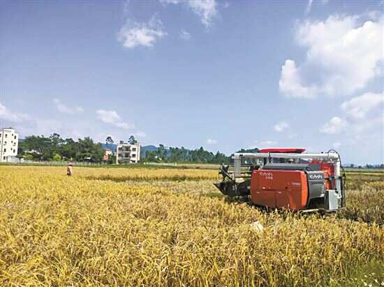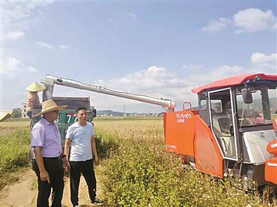 新快报讯 记者农艳芳报道 在茂名市电白区树仔镇大塘村的农户水稻种植区,一串串饱满稻穗压弯了稻秆,轰鸣着的收割机在金黄色的稻田里来回穿梭,收割、脱粒、碎秆还田,不一会,金黄稻粒就被送进农户开来的农用车中……“如今我们村有能提供收割机的合作社,20多分钟就能收割一亩田,可算是便利了我们种植户了。”大塘村民一边说着,一边平整车上的稻粒,脸上洋溢着丰收的喜悦。