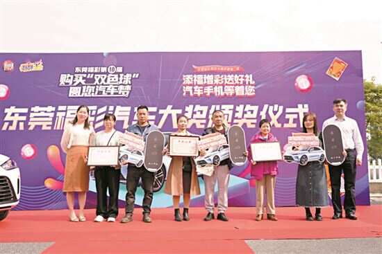 新快报讯 记者陆妍思 通讯员粤福彩报道 11月15日,东莞福彩第十届“购买双色球 圆您汽车梦”大型营销宣传活动暨刮刮乐“添福增彩送好礼 汽车手机等着您”促销活动汽车大奖颁奖仪式举行。现场,东莞市福利彩票发行中心为获得汽车大奖的幸运彩民颁奖,为销售站点业主代表颁发中奖证书。