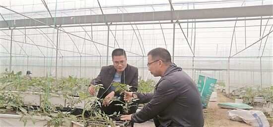 ■黄镇杰(左)在番茄大棚种植基地了解晚季种植情况。