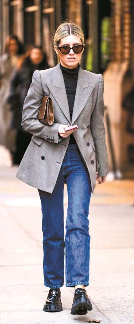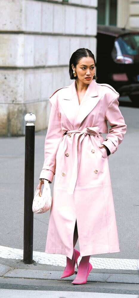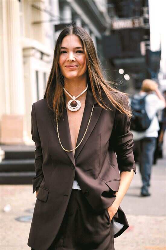 有硬度的宽肩中钝感较明显的款式会带来力量感,棱角分明的宽肩会有不同程度的起翘,展现较为活泼灵巧的形象。而硬挺度没那么高的宽肩,可能会带来落肩感,这类型服装会多些柔和,但不适合肩背较宽、手臂较粗的时髦精,会显“壮”。