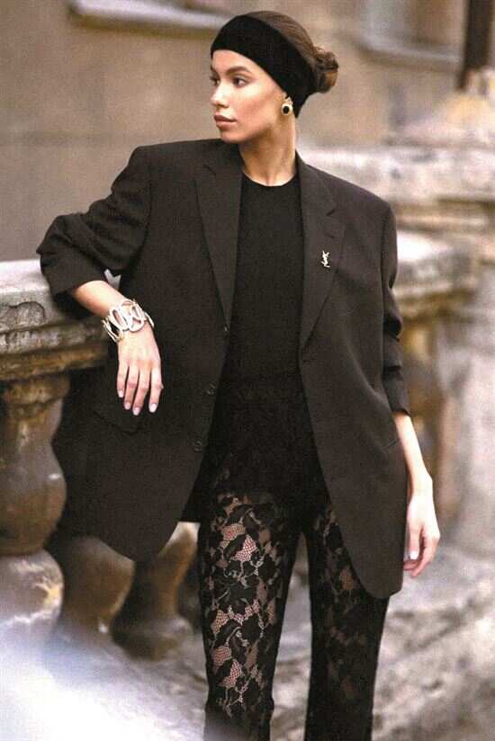 ■搭丝袜、薄纱、包臀裙、尖头高跟鞋等女性气质较强的单品,化解夸张垫肩的过度硬朗。