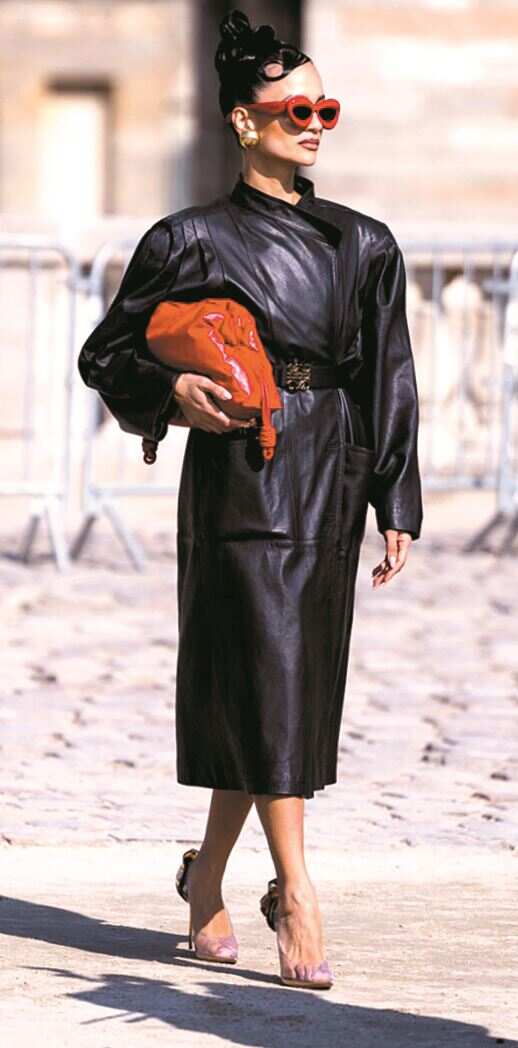 ■宽肩窄腰的皮质外套在硬朗线条下凸显女性身材曲线的利落之美。