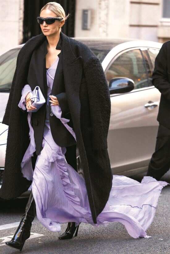 ■长长的衣摆通过硬挺的肩部“支棱”起整体造型穿搭的气场。