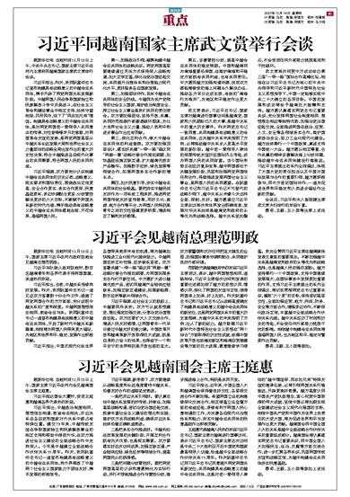 习近平强调,双方要充分认识构建中越命运共同体的历史必然、战略意义、现实要求和国际责任,围绕政治互信更高、安全合作更实、务实合作更深、民意基础更牢、多边协调配合更紧、分歧管控解决更好的六大目标,不断赋予两国关系新的时代内涵,携手推动具有战略意义的中越命运共同体落地生根、开花结果,造福两国人民。