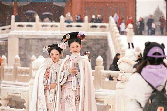 12月13日,北京再次迎来大雪天气,不少游客前往故宫游玩赏雪。