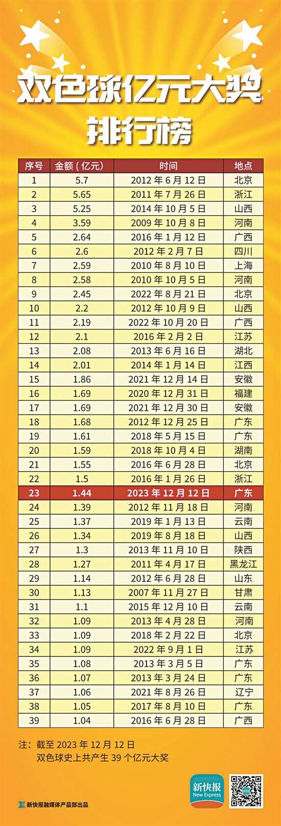 本次广州1.44亿元巨奖,是福彩双色球在2023年开出的第一个亿元奖,距离2022年10月20日晚广西南宁双色球2.19亿元巨奖相隔418天。同时,这也是双色球历史上第39个亿元奖,排名第23位。