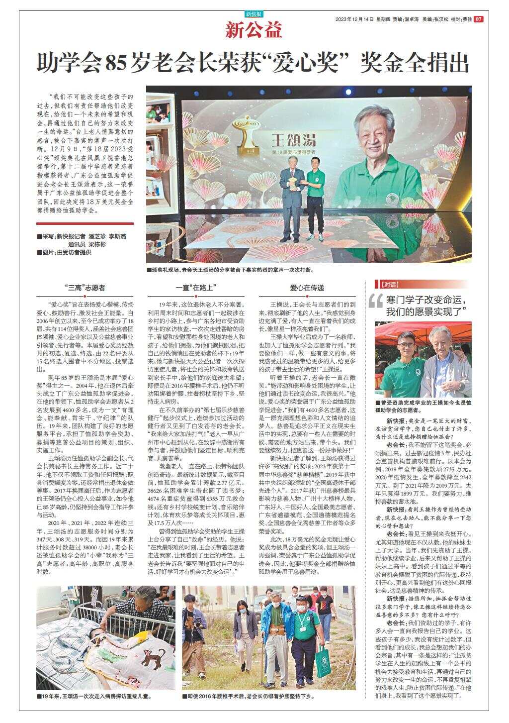 助学会85岁老会长荣获“爱心奖” 奖金全捐出