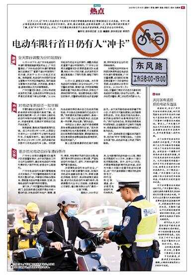 12月15日,新规正式实施。为引导电动自行车驾驶人安全守法出行,广州交警在东风路、黄埔大道、天河东路等路段都设置了相关禁令的标识,并标注了具体的限行时间。每当看到有进入限行区的骑手,交警都会现场执法并宣讲新规,同时派发安全出行的传单给骑手。