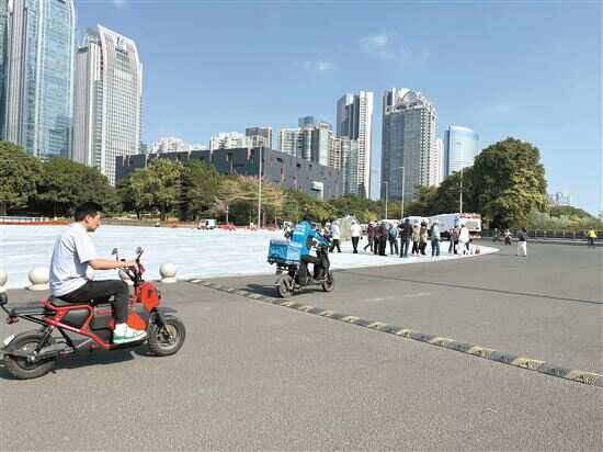 在花城广场与海心沙亚运公园北1门交界处的通道上,有骑手、外卖员等人在骑行。记者留意到,虽然附近通告中明确告知通道不允许自行车骑行,但骑手和行人好像约定俗成般地有序“分好工”:行人在广场散步,骑行者在外围骑行。广场的外围放了些车阻石,虽未完全将外围包裹住,但阻止了部分车辆进入。通道上设置了缓冲带,因而骑手的速度不会太快。有骑行的市民表示,自己骑行多年,不知道此处通道不允许骑车。
