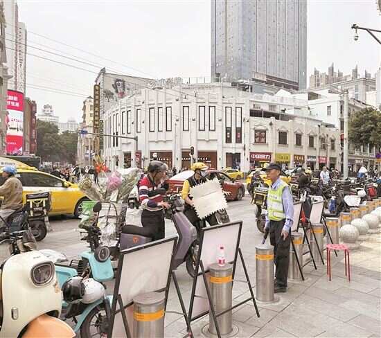 相较于公园、广场等场所,地处商业区的步行街,人多、车多、路口多,管理成了“老大难”。虽然步行街在主要出入口均设置了电动自行车、自行车等车辆禁止入内的标识,并有工作人员现场疏导管理交通,但执行效果欠佳,不少电动车肆意穿行。