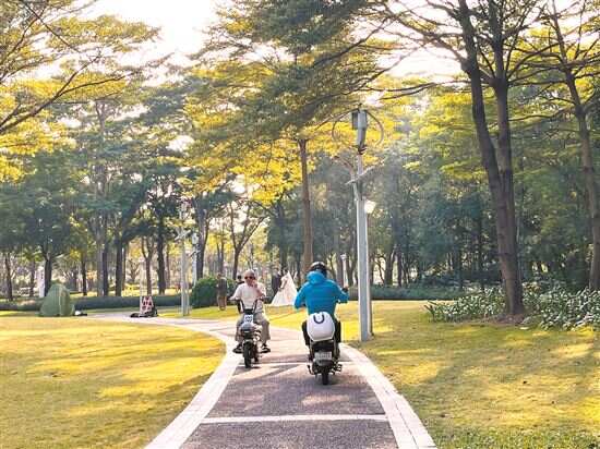 玉树公园连接着科学城三号空中连廊,被称之为“玉树花廊”。记者在现场看到,有市民从连廊上骑着自行车通过,但不会骑车进入公园。连廊与公园中间有处保安亭,保安说,如果市民骑车过来,他们会引导大家将车辆停放在桥底下,那里设置了雨棚和停车位,供市民停车。对于即将实施的新规,行人李先生十分赞成,“我不喜欢电动车横冲直撞,公园、广场不是大家骑行时赶时间、抄近道的地方。”