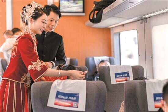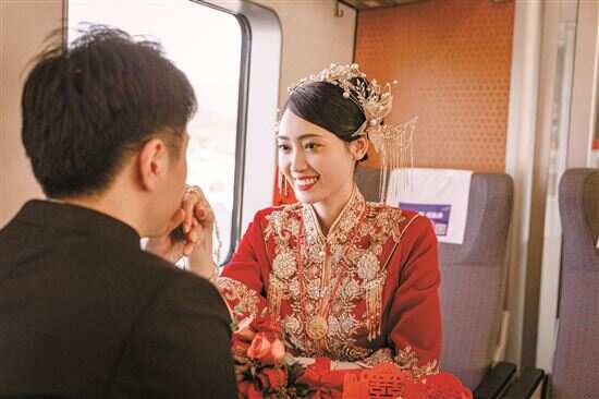 文婷主张一切从简,所以接亲队伍只有八个人,不过,身着全套婚服的一对新人还是受到不少关注,大家都对坐高铁接亲的形式非常新奇。起初,文婷也担心过在高铁车厢里拍照会影响到其他乘客,她和先生也提前向乘客派发喜糖表达歉意,但大家都高兴地表示理解。“乘客都很热情,说要沾沾喜气,也收获到很多陌生人的祝福,令我们感到非常温暖。”而这辆特别的婚车也被文婷的朋友戏称为“史上最贵的婚车”。“现在距离我们结婚已经过去两年多,但直到现在还会有朋友提起我们当初坐高铁婚车,真的很酷。”