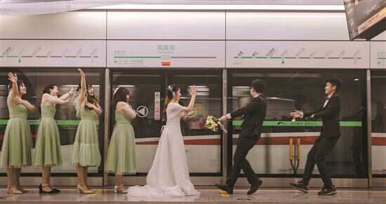 “我一开始就没考虑过传统婚车。”今年4月,刘小姐在四川成都举办了一场简单而温馨的婚礼。原本,刘小姐准备让大家一起骑电动自行车去酒店,但考虑到伴娘们都穿着长裙,骑车不方便又危险,便萌生了坐地铁的想法。“反正大家都很‘社牛’,坐地铁能让陌生人一起感受新婚的喜悦,我们又能收到陌生人的祝福,我觉得很有意义。”