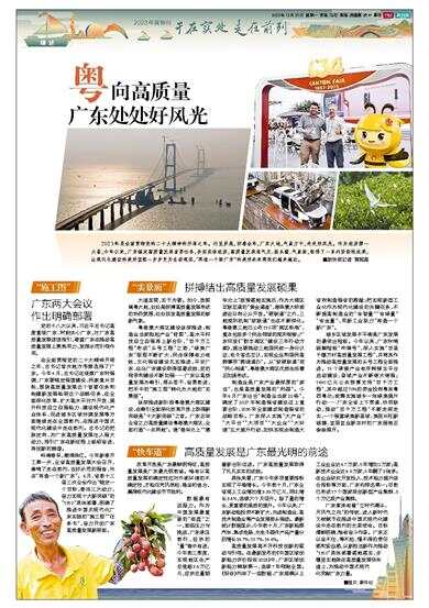 粤港澳大湾区建设纵深推进,制造业当家挺起产业“脊梁”,高水平科技自立自强再上新台阶,“百千万工程”形成“头号工程”之势,“绿美广东”版图不断扩大,民生保障有力有效,文化强省建设扎实推进,平安广东、法治广东建设取得显著成效,党的领导和建设不断加强……广东以高质量发展为牵引,埋头苦干、奋勇前进,把手中的“施工图”转化为大地的“实景画”。