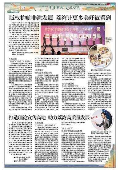 近年来,荔湾区立足区位优势,不断创新探索“非遗”+“版权”,2021年推出了广州首个区级版权服务和保护广州非遗街区(永庆坊)工作站;2022年在全市率先打造具有版权展示、交流、宣传、交易等功能的“荔湾非遗版权交易平台”;2023年举办了粤黔非遗版权创新交流活动和荔湾非遗文化元宇宙版权创新发展交流活动,走出一条版权助推非遗文化成果转化成生产力的新路径,助力广州荔湾高质量发展。