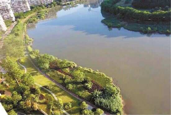 行走在砺江河碧道,水面上鹭鸟翩飞,岸边居民休闲散步,形成一幅美丽河岸画卷。