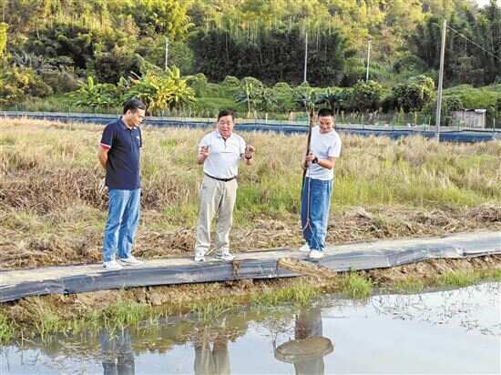 驻镇帮扶不久,于建军就了解到,发展稻虾共养项目是解决土地撂荒、守护粮食安全和促进农户增收一举多得的产业,对于项目选择在哪里落地却犯了难。工作队对白渡镇各村的两委干部进行了考察和交流,最终选中了凤岭村。原因是凤岭村的党支部书记刘绍南以及村干部有很强的发展意愿和执行力。去年,驻白渡镇工作队帮助凤岭村引入梅州市郁葱农林发展有限公司,“凤岭村仅用了一个月就集约了270亩撂荒土地,用于发展水稻种植与澳洲淡水青龙虾共养项目,村民每亩可获租金400元/年,并逐期递增,租期达20年。”于建军说,强大的执行力为产业发展奠定了基础。