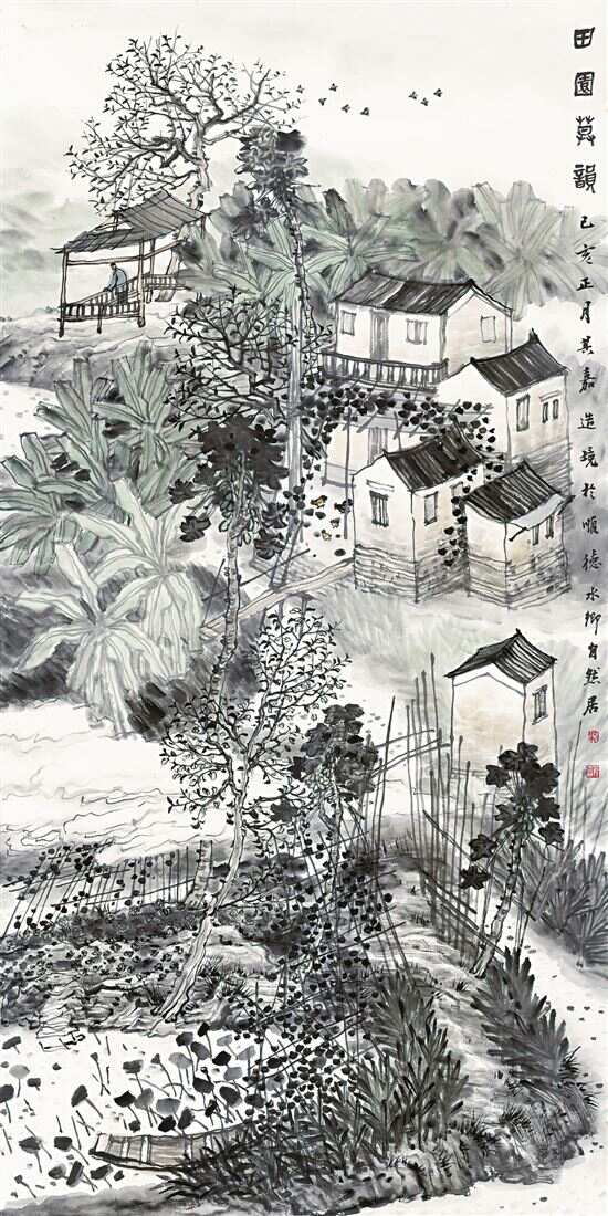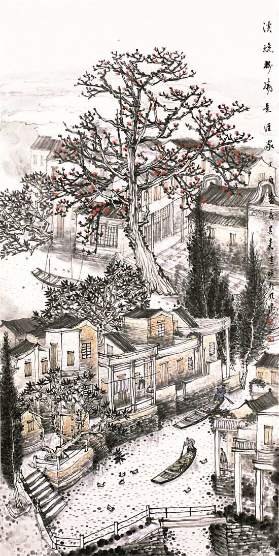 诗是无形画,画是有形诗。自古以来,诗与画都在精神层面上构筑理想的景象,东晋诗人陶渊明的“采菊东篱下,悠然见南山”更成为了后世诗人与画家在远离尘嚣、追逐田园和自然避世理想的范例。然而,当代知名画家叶其嘉则选择了另一种方向,他探索数十年,一直在入世中寻找自然之道,把大隐于市,大隐于生活的哲理诉诸笔墨,犹如清代画家石涛所云,“天地氤氲秀结,四时朝暮垂垂,透过鸿蒙之理,堪留百代之奇。”叶其嘉创作了一幅幅堪为经典的水墨水乡,已使其成为当地水乡题材中的佼佼者。