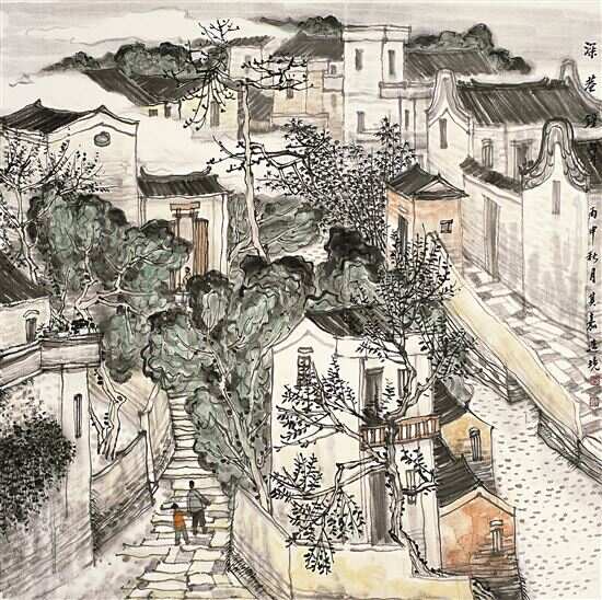 德国诗人侯德林有两句诗极具意思:谁沉冥到,那无边无际的“深”,将热爱着,这最生动的“生”。在一个表现情和景交融互渗的艺术造境中,透过一幕又一幕的景,挖掘一层又一层的情,这是最深的情。叶其嘉通过一幅幅水乡题材作品,描绘乡情、乡趣、乡愁,折射出的是他思乡、恋乡、念乡的深情。在他的画面中,有热闹的场景,而并不喧嚣,有逸静的时刻,却不乏生气,画面所体现的韵律、节奏、秩序、理性,却时刻折射出生命、动力、热情的能量。在动中寻极静,也在静中寻极动,寂而常照,照而常寂,这正是禅的体现。