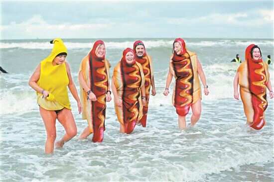 当日,比利时港口城市奥斯坦德举行传统的“跳海庆新年”活动,众多参加者身着各式服装跳进北海,期盼在新的一年拥有强健的体魄。