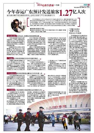 2024年的春运从1月26日开始,到3月5日结束,前后共40天。据省交通运输厅预计,今年春运全省发送的旅客量将达到1.27亿人次,比2023年增长约25%,公路、铁路、民航、水运相较往年均有大幅增加。昨日,广东省交通运输厅上线“广东民声热线”春运特别节目,针对今年春运客流、车流持续高位运行的情况,省交通运输厅方面表示将加强综合执法,针对高铁站、机场枢纽非法营运、超载、超限以及黄牛,会同公安部门严厉打击违法的载客行为,确保广大旅客出行顺畅。