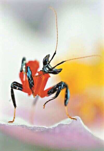 在奇异植物室的兰花展示箱前,总会传来:“你找到了吗?在哪在哪?”的声音,那一定是大家在睁大眼睛寻找这位大明星的身影,有时候蹲了几十分钟都没找见,简直比开隐藏款盲盒还难。兰花螳螂体型小,其1龄若虫阶段,兰花螳螂宝宝只有蚂蚁的大小。而到了2龄阶段,兰花螳螂就开始变身伪装大师,从原先暗红色小蚂蚁摇身一变成为了娇艳欲滴的小花儿。如果你凑近看,还会发现其腿节变宽大模拟成花瓣的形状,胸部淡绿色模拟出花梗的样貌,平时就躲在花丛间,将头部和胸部靠近花瓣,同时腹部高高翘起,两对后足水平展开,俨然张开的花瓣。