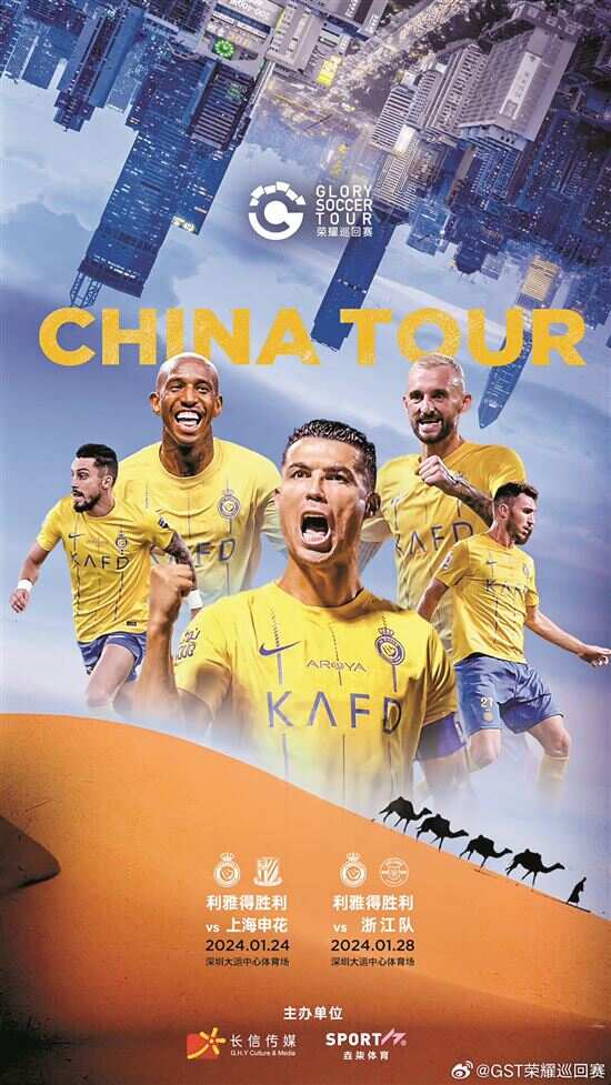 据此前报道,2023年12月17日,此次赛事主办方GST荣耀巡回赛官宣两场“荣耀巡回赛2024利雅得胜利中国行”比赛将于2024年1月24日、1月28日在深圳市大运中心体育场举办,C罗领衔的利雅得胜利将先后对阵上海申花、浙江队两家中超联赛俱乐部,为中国球迷献上两场星光熠熠的国际足球较量。