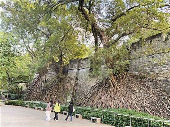 有趣的是,当记者前往越秀公园探问老榕树所在时,不少街坊纷纷“侧目而视”,“在广州,老榕树还用找?到处都是啦!”而外地来的游客则对明城墙上的这几株“飞榕”叹为观止,从不同的角度打卡拍摄。来自山西的陈阿姨说,她就住在越秀公园西门外的一家连锁酒店,来广州游玩的这些天,她每天早上或傍晚都会在公园里漫步一会,“每次路过这几棵老榕树前,都忍不住看上一会,不单单是好看,更是觉得它们生命力太惊人。”