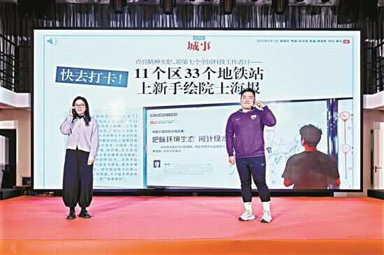 ■新快报记者麦婉诗(左)与贾典(右)表演的“院士画传”串场小剧场。