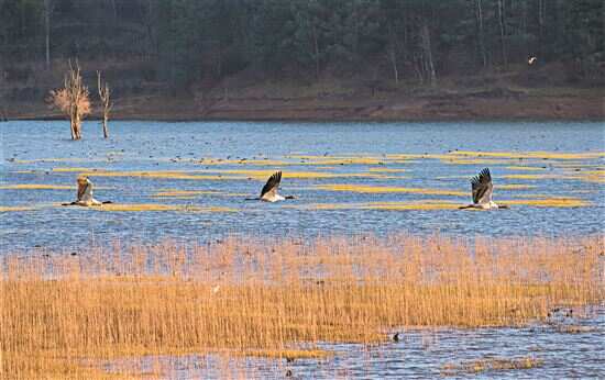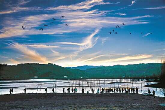 不同季节、不同时段的念湖,都会呈现出不同的景别。清晨,湖水清粼,云雾变幻,薄雾像是一层欲语还休的面纱,唯有光芒万丈的太阳可将其轻启;黄昏,水面被落日余晖洒满金光,那几株站立在湖面的枯树伴着黑颈鹤娉婷的身姿,静美斑斓,直若进入仙境。晴天有晴天的美好,雨雾天有雨雾天的氤氲,朦胧幽寂如梦似幻的美,更像中国山水画般云淡风轻,却又惊心动魄。
