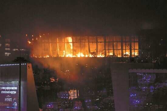 ■“克罗库斯城”音乐厅火光冲天,冒出滚滚浓烟,房顶几乎完全坍塌。新华社发