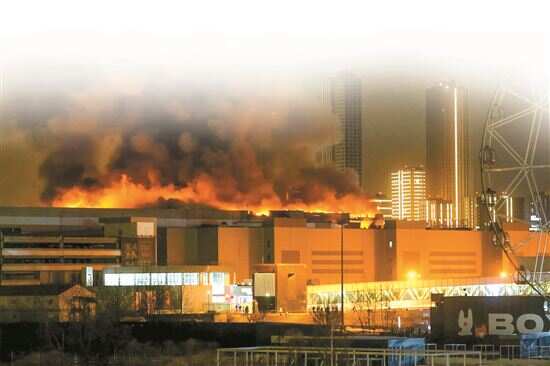当记者的车辆行至距离事发地点一公里处时,道路开始拥堵,在车里都能闻到一股浓重烟味。继续低速行驶一段距离后,记者在大环线路边看到,“克罗库斯城”商贸综合体中的一座建筑物火光冲天,冒出滚滚浓烟,房顶几乎完全坍塌,最上层的外窗破碎,不时有火苗蹿出。数架直升机正在事发现场上空洒水灭火。