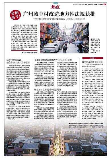 3月29日,省十四届人大常委会第九次会议举行第二次全体会议。会议表决通过关于批准《广州市城中村改造条例》(以下简称《条例》)的决定。《条例》是广州首次针对城中村改造进行的立法工作,也是全国首个专门针对城中村改造的地方性法规条例。《条例》对城中村改造目标、改造方式、改造工作流程、土地征收、纠纷解决和法律责任等方面进行了规范。《条例》规定,拆除新建类城中村改造项目启动之前,须得到改造项目所在村的农村集体经济组织三分之二以上成员和三分之二以上十八周岁以上村民同意。过半数被征地的农村集体经济组织成员对征地补偿安置方案有异议,应当组织召开听证会。