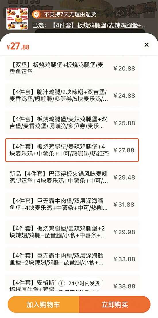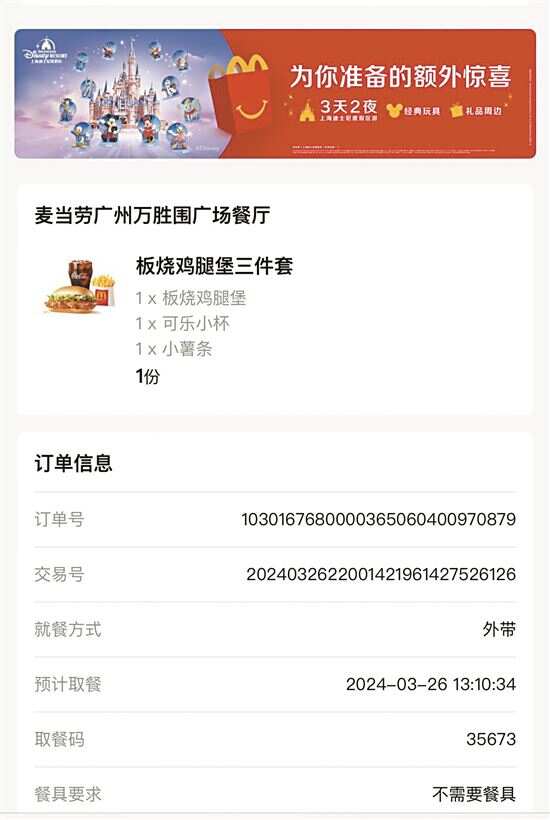 “整个过程异常地轻松。”龙先生感慨,他只需在商店选择自己想要的套餐并支付,商店客服就会提供一个链接,通过该链接选择取餐门店并提交订单,等待短短20秒,取餐码便送达手中,接着龙先生在门店利用取餐码直接领取了他的餐点。他这次的订单包含一个板烧鸡腿堡、一份麦乐鸡块、一份薯条和一杯可乐,只花费了27.88元,远低于实体门店的59元标价,节省了30多元。对于这种购买方式,龙先生感到非常满意,不仅便宜而且很方便。