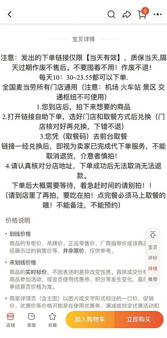 根据龙先生的指导,记者点开龙先生推荐的这家商店页面,该店显示下单可在全国麦当劳所有门店通用,每天10∶30—23∶55都可以下单,但需注意的是机场、火车站、景区、交通枢纽等区域不可使用,不支持外送,取餐码一经发送后,不能退货,介意者慎拍。