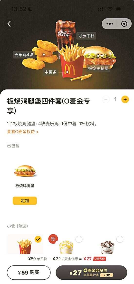 ■龙先生购买的麦当劳四件套在小程序上原价是58元。