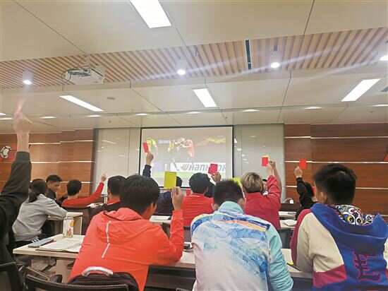■广州市足协举行的二级裁判培训班上,各位学员在视频讨论中出示红黄牌。