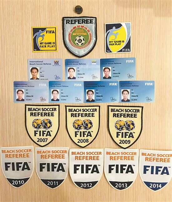 ■前沙滩足球国际级裁判员李克展示自己的裁判工作证和胸徽。