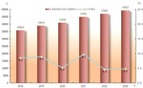 全年全省居民人均可支配收入49327元,比上年增长4.8%。分城乡看,城镇居民人均可支配收入59307元,增长4.2%;农村居民人均可支配收入25142元,增长6.5%。全年全省居民人均消费支出34331元,比上年增长6.7%。分城乡看,城镇居民人均消费支出39333元,增长6.5%;农村居民人均消费支出22209元,增长6.8%。全省居民恩格尔系数为32.4%,比上年下降1.9个百分点;其中城镇为31.2%,农村为37.6%。
