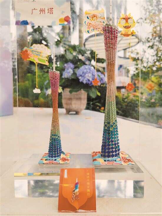 在红棉文创展中展出了一款“广州塔木棉花胸针”,广州塔颜色绚丽,木棉花从塔身延展而出。