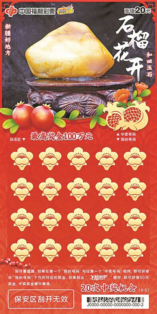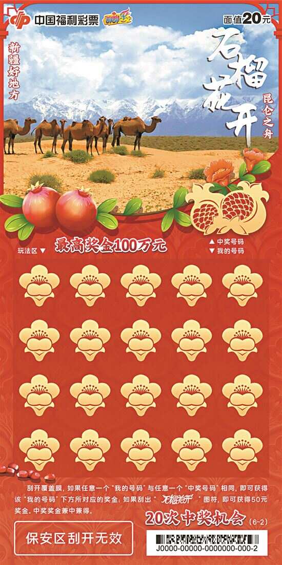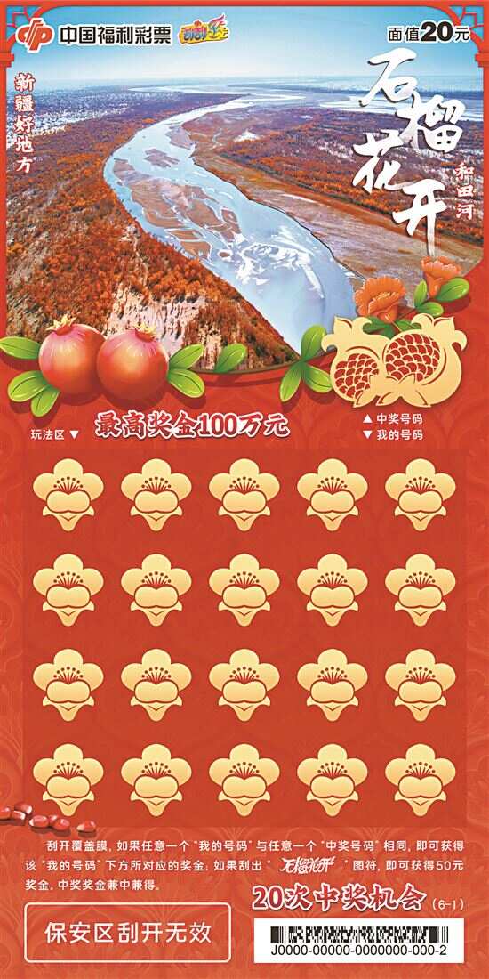 “新疆好地方-石榴花开”刮刮乐游戏,6张票面分别涵盖了“石榴花”“和田河”“昆仑之舟”“和田玉石”“环湖公园”“沙漠公路”等6个具有代表性的地方特色自然美景,传递出大美新疆的无限魅力,为购彩者带来一场充满地域特色的文化体验。“福彩+文旅”多了一次新表达、新呈现。
